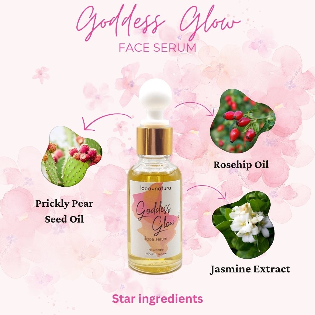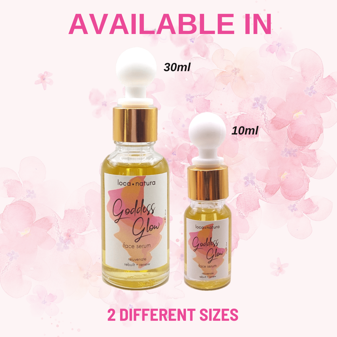 Goddess Glow Face Serum is infused with a rich blend of fatty acids (Omega-9 and Omega-6), vitamins (A, B1, B2, B6, B17, C, and E), and linoleic acid, working together to rejuvenate the skin and combat free radicals responsible for wrinkles.