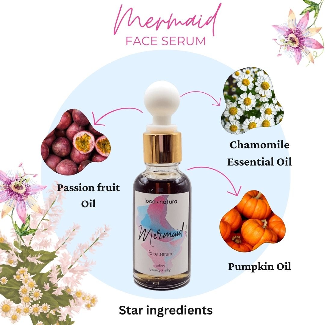 Mermaid Face serum carries a rich yet lightweight feel, infused with the nourishing essence of pumpkin seed and passionfruit seed oils for a luminous, dewy complexion.
